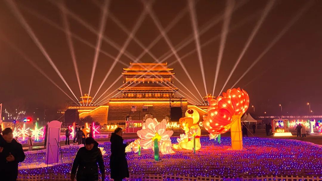 花燈璀璨迎新春。夜幕降臨,在千年運河之畔,淮安漕運門,一組組花燈立于城墻腳下,交相輝映,共同組成了美麗花燈海洋,美輪美奐。市民游客徜徉在燈陣之中,盡情感受流光溢彩的景觀與喜樂氛圍?,F(xiàn)場市民說:“我剛剛跟朋友一邊吃一邊玩一邊看,拍了好多好看的照片。在那邊還有漕運門城墻光影秀,非??犰??!?
