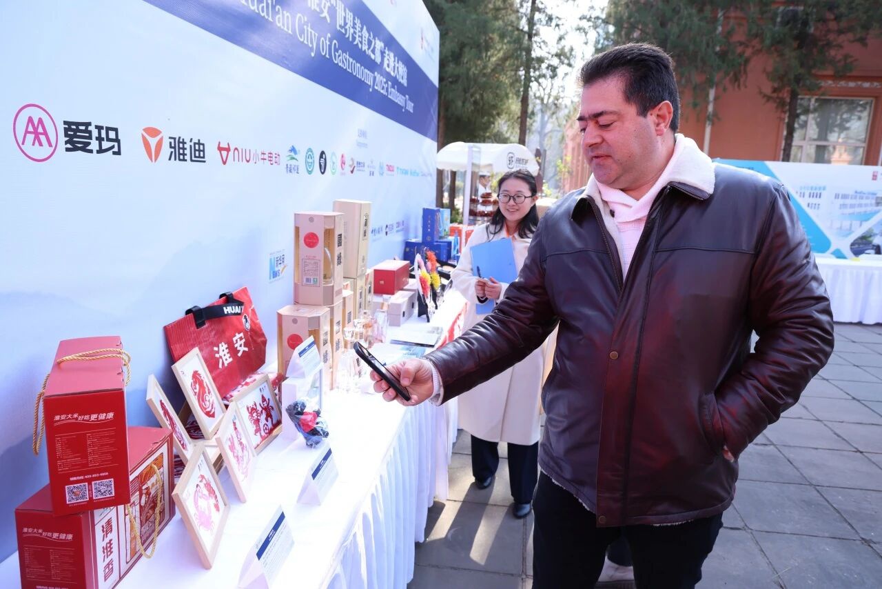 在淮揚菜集團展區(qū)內,不僅帶來了淮安菊雕、剪紙等非物質文化遺產展示,更集中呈現(xiàn)了淮鹽、芡實、淮揚老雞湯、今世緣白酒、盱眙十三香龍蝦等優(yōu)質淮安好物,大使館的嘉賓們饒有興致地駐足觀看交流。